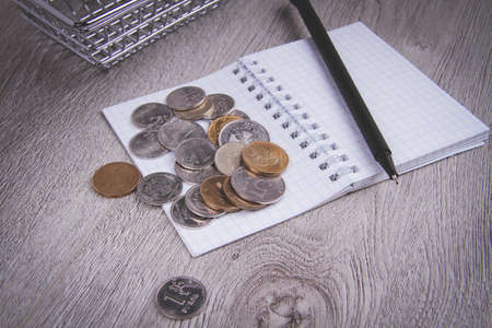 Money and notepad for shopping. shopping list. food basket. Money for food purchases.