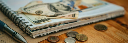 A stack of cash sits atop a notebook filled with notes and calculations alongside scattered coins on a wooden surface.