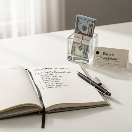 On a marble desk, a notepad with budget details, cash bills, coins, and financial charts are arranged, showcasing tools for effective financial planning.