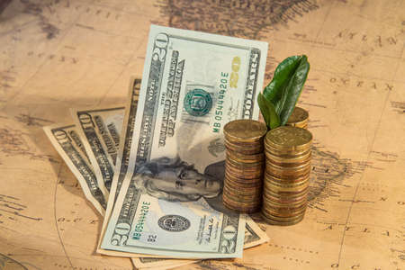Green plant growing on money coins under world map background, business and investment concept