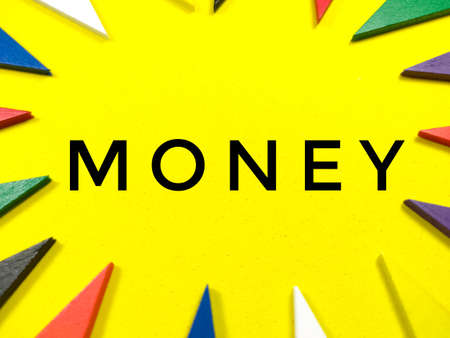 Colorful pieces of wood on yellow background with text MONEY