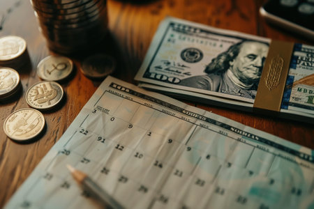 Office workplace desk with dollars and calendar. Counting money for salary. Investment savings. Finances, economy and home concept. Business budget of wealth and prosperity finance. Workspace office