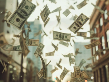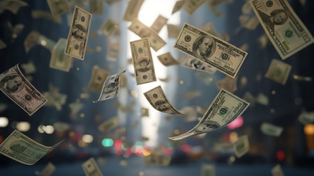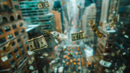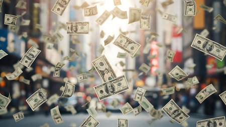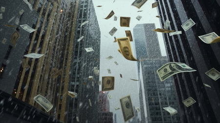 Dollar bills float down a rainy city street, symbolizing financial prosperity, wealth, and economic opportunity amidst urban life