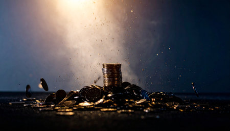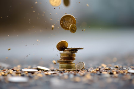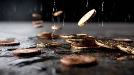 A captivating scene depicting coins falling amidst raining droplets on a dark surface, showcasing the intricate details of currency and water interaction.