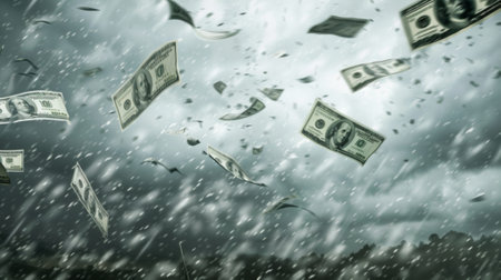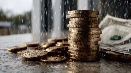 This dramatic image captures stacked coins amidst rainfall, complemented by dollar bills, symbolizing wealth juxtaposed with uncertainty and economic change.