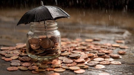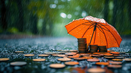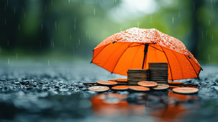 Raindrops fall on a vibrant orange umbrella, shielding a stack of coins resting on a wet surface. The scene evokes a sense of financial security amidst challenges in nature.