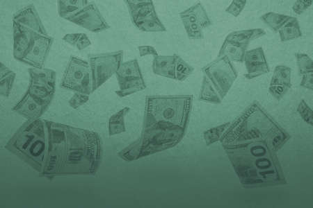 Money is falling from the sky. Falling banknotes on a green background. Hundred dollar bills in free fall.