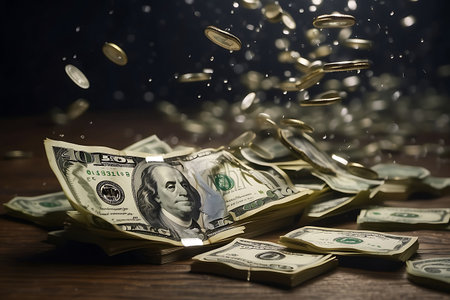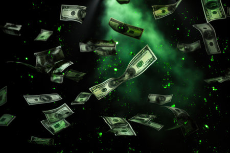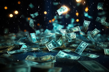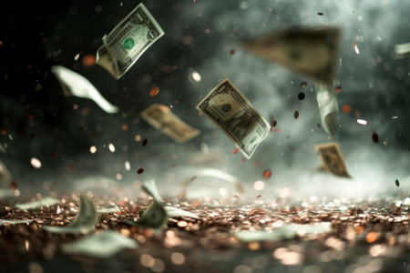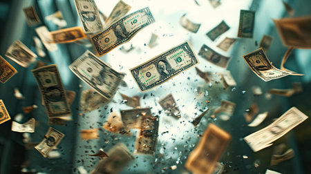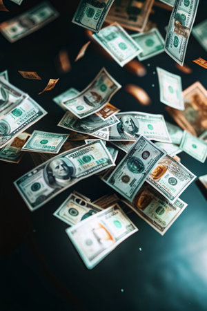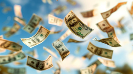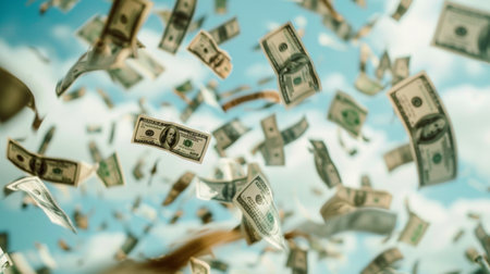 Experience a captivating visual of US dollar bills floating in the air, symbolizing prosperity and financial success in a mesmerizing representation of wealth.