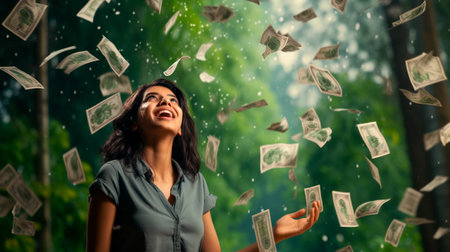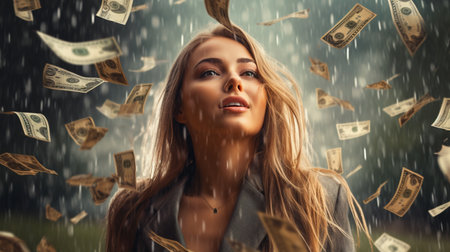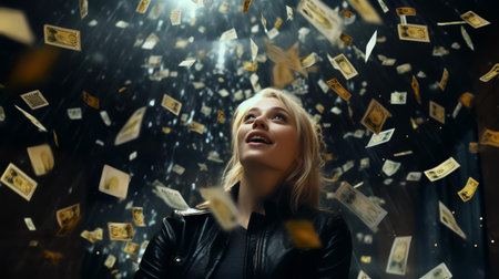 Woman is smiling while she is surrounded by money falling from her jacket. Generative AI.