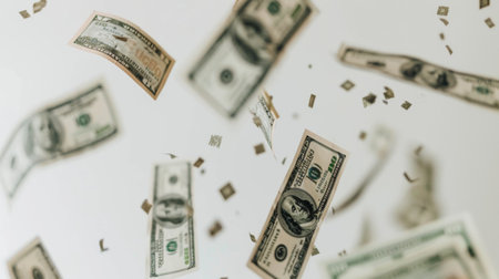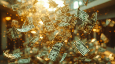 An exhilarating scene showcasing US dollar bills cascading through the air, evoking a sense of wealth, opportunity, and dynamic energy in a soft-focused environment.