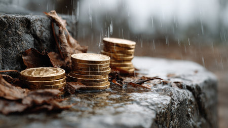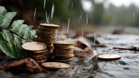 This image captures golden coins resting on a stone surface, surrounded by wet leaves as rain pours down. The scene evokes themes of wealth and nature.