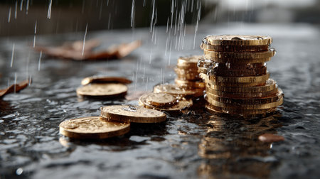 A captivating image of glistening coins stacked in the rain, symbolizing wealth and prosperity. The water creates reflections and enhances the allure.