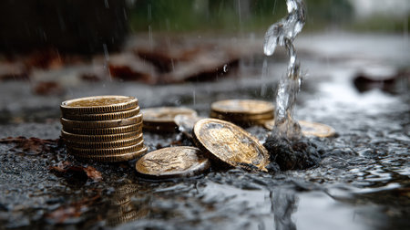 A detailed image of coins stacked in an urban environment, with rainwater cascading down, creating a visually striking moment of reflection on wealth and finance.