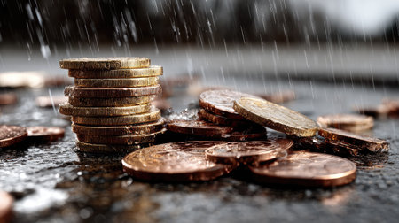 An artistic close-up of coins scattered on a wet surface during a rainstorm, highlighting the contrast between the shiny currency and the natural elements.