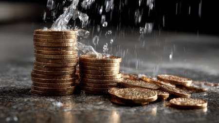 Close-up image of stacked coins on a wet surface with water splashing. This visually stunning representation showcases financial themes and investment concepts.