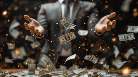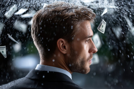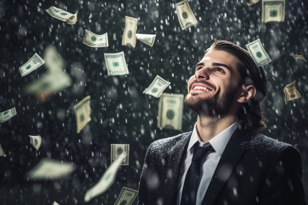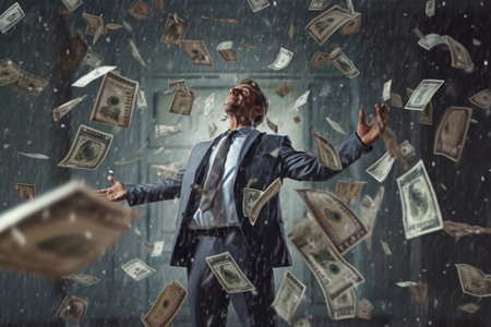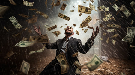 A well-dressed man stands confidently as currency falls around him, capturing a moment of success and ambition.