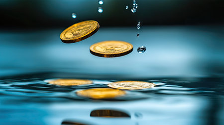 A captivating scene featuring golden coins splashing into water, surrounded by cascading droplets, symbolizing wealth, investment, and prosperity.