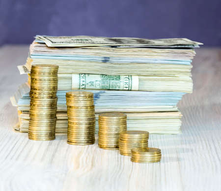 Thick stack of US cash stack of US cash in mixed notes of different colours and tones, positioned on the wooden table