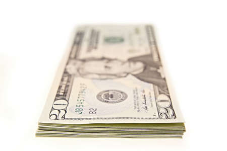 Large dollar bills stack isolated on white background. Money and finance concept. Wages or savings in cash. High quality photo