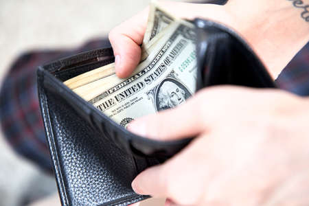 A man is holding an open wallet with money in his hands. Hands take out bills from his wallet. The concept of rejection of paper money, inflation, financial crisis.