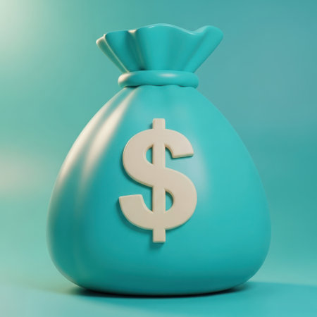 A stylized teal money bag with a prominent white dollar sign, set against a soft blue background.