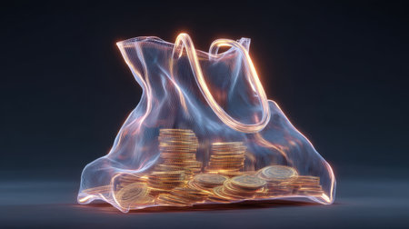 This captivating 3D render showcases a transparent bag filled with gleaming gold coins, enhanced by glowing light effects against a dark backdrop, symbolizing wealth and finance.