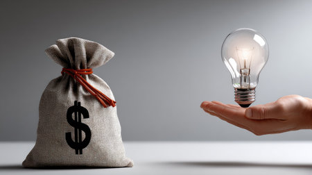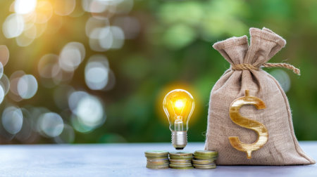 This image creatively illustrates a financial theme, featuring a light bulb symbolizing ideas and innovation with money bags and coins on a soft, green background.