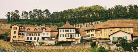 Small village on the hill in Lavaux vineyards, spring hiking activity in Switzerland