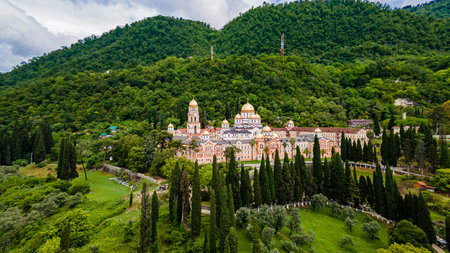 Top view of Orthodox monastery in Novy Afon, Abkhazia. Christian temple in New Athos. Photo from above.