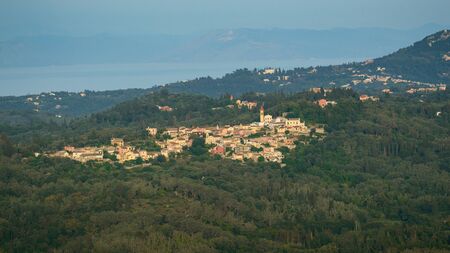 Corfu, a small town built in the mountains between the trees, panorama from the Kaiser throne vantage point.