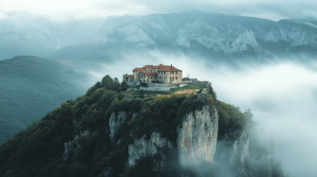 A solitary monastery stands on a rocky outcrop, enveloped by fog and low-hanging clouds. The mountains loom in the background, creating an enchanting atmosphere at dawn.