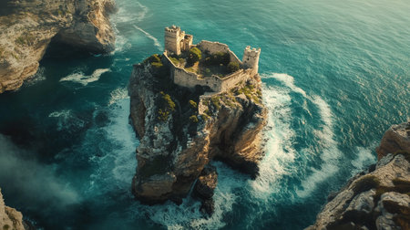 A castle from the medieval era sits atop a cliff, overlooking a dramatic landscape, A medieval castle perched on a cliff overlooking a vast kingdom