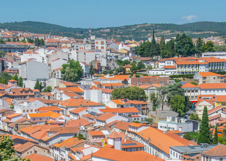 High-angle view of bragança city showcasing terracotta rooftops and dense urban layout surrounded by trees.