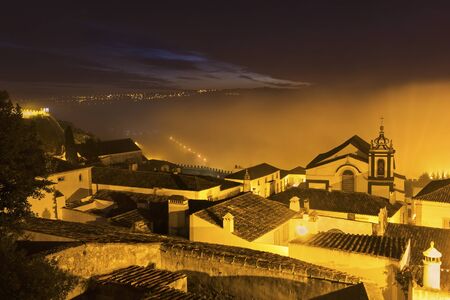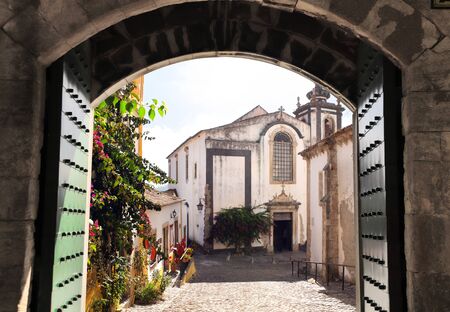 View through the old gate on cathedral and houses in medieval narrow street, Obidos, Portugal, Europe