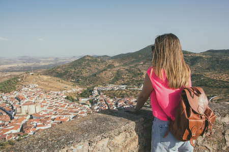 Feria town, located in Extremadura, Spain Stock photo of a rear view of a woman contemplating the landscape of a village surrounded by nature in a valley. Travels