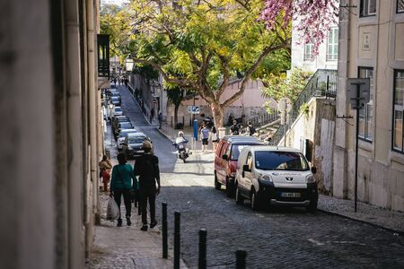 Lisbon, Portugal - SEPTEMBER 24 2017: Tourists with vintage carriage tram on famous 28 line in Lisbon.