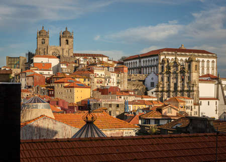 View of the city of Porto and cathedral, Portugal across ancient tiled rooftops