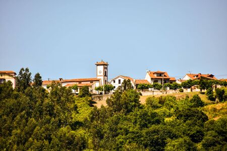 Countryside landscape with white houses on hill covered by trees and cultivated fields, in a sunny day at Manteigas. It is the genuine mountain village at the Serra da Estrela on eastern Portugal.