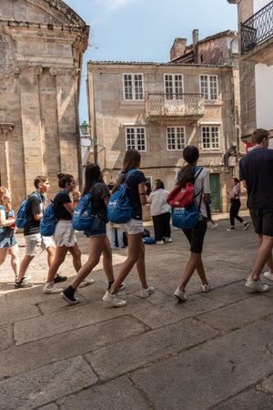 Santiago de Compostela, Spain. august 5, 2022: thousands of young pilgrims dance in arrive in Santiago