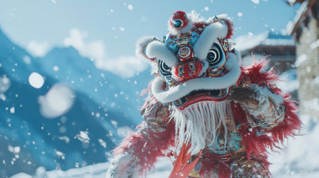 Chinese lion dance in a traditional costume at the chinese lunar new year festival.