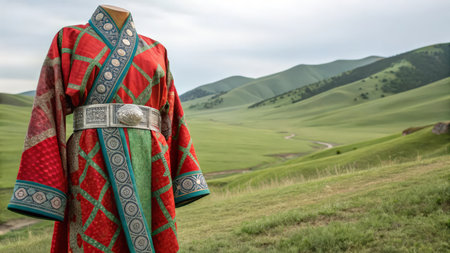 Nomadic mongolic family in traditional attire amidst a natural landscape, expressing cultural heritage.