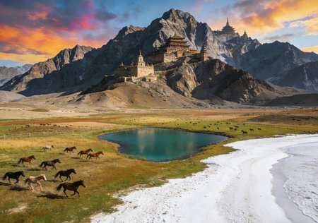 3D rendering of a desert landscape with horses, temples and mountains