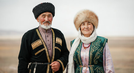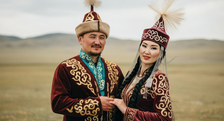 Traditional kazakh attire worn by asian male and female in scenic landscape