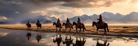 people riding horses on the beach are traditional Mongolian eagle hunter. Generative Ai