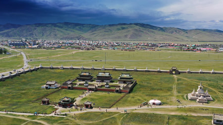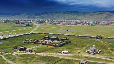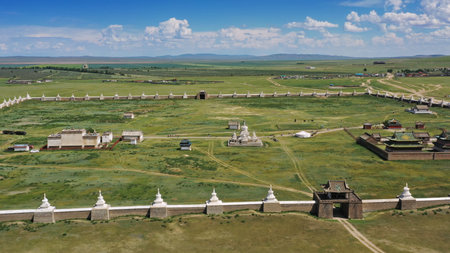 Aerial view of the Kharkhorin Erdene Zuu Monastery in Kharkhorin (Karakorum), Mongolia. Karakorum was the capital of the Mongol Empire between 1235 and 1260