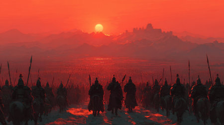 A large contingent of soldiers on horseback advances through a rugged terrain as the sun sets behind distant mountains, casting an orange glow over the scene. Tension and anticipation fill the air.