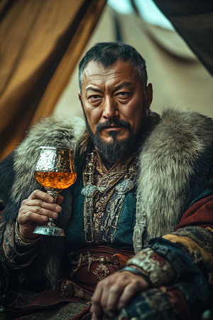 In a richly decorated tent the Mongolian khan savors wine from a skull shaped goblet. His luxurious attire and fur accents reflect a moment of celebration and power among his followers.