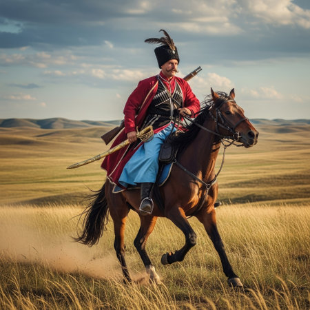 Ukrainian man in ethnic costume riding a horse in the steppe.