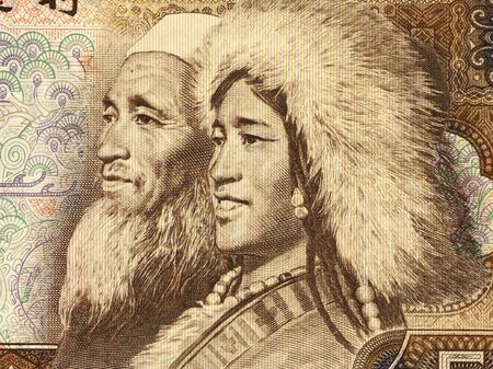 Old Tibetan Man and Young Islamic Woman on 5 Yuan 1980 Banknote from China.