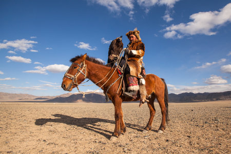 bayan Ulgii, Mongolia, 4th October 2015: kazakh eagle hunter in alandscape of western Mongolia